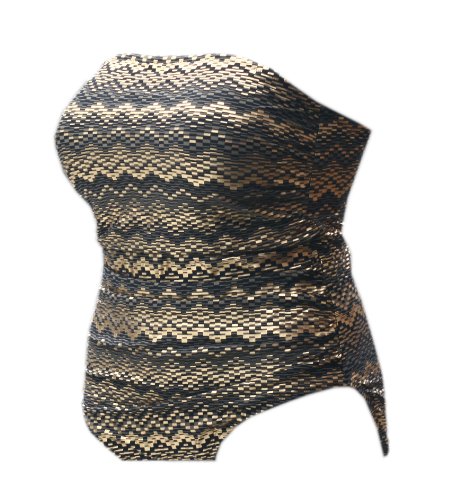 Gold- Schwarzfarbender trägerloser Badeanzug in einem exklusivem Design. Formendem Vorderfutter, Softschalen, Unterbrustband und Bügeln an den Seiten für den perfekten Sitz. Kein Verrutschen dank des rutschfesten Silikonbandes.Raffungen an den Seiten. 80% Polyamid, 20% Elasthan.