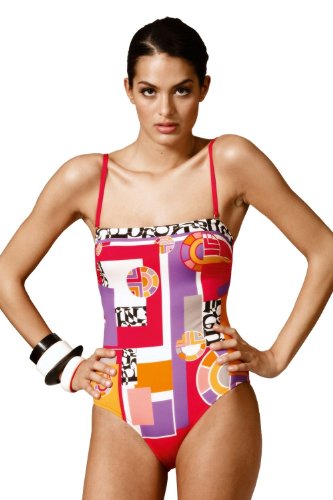 Féraud Paris Ethnic & Puzzle - spannungsvoll, graphisch, trendig Dieser Badeanzug von FÉRAUD Paris ist im Bandeaux-Stil geschnitten. Der graphische Druck in Puzzle-Optik ist ausdrucksstark und überzeugt durch die leuchtenden Farben. Ein Hingucker sind die Schmücker mit dem orginalen Féraud Buchstabendruck der DOB-Laufstegkollektion. Der Rückenteil ist harmonisch in roter Unifarbe gestaltet. Verstellbare und abnehmbare Träger und eingearbeitete Softcups unterstützen den Tragekomfort. Beste Lycra Qualität sorgt für ein Wohlfühl-Erlebnis beim baden und bräunen.
