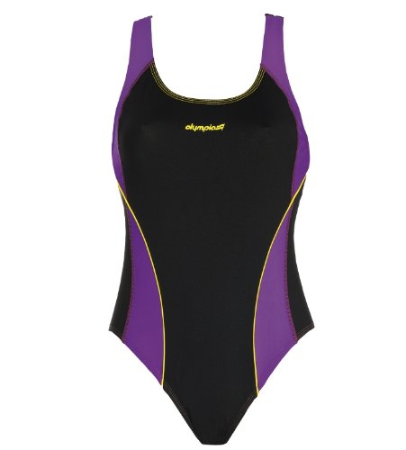 Sportschwimmer Badeanzug in schwarz mit färbigen Kontrastnähten und lila Einsatz. Am Rücken ist der Träger zusammengefaßt, für einen optimalen Halt bei viel Bewegung